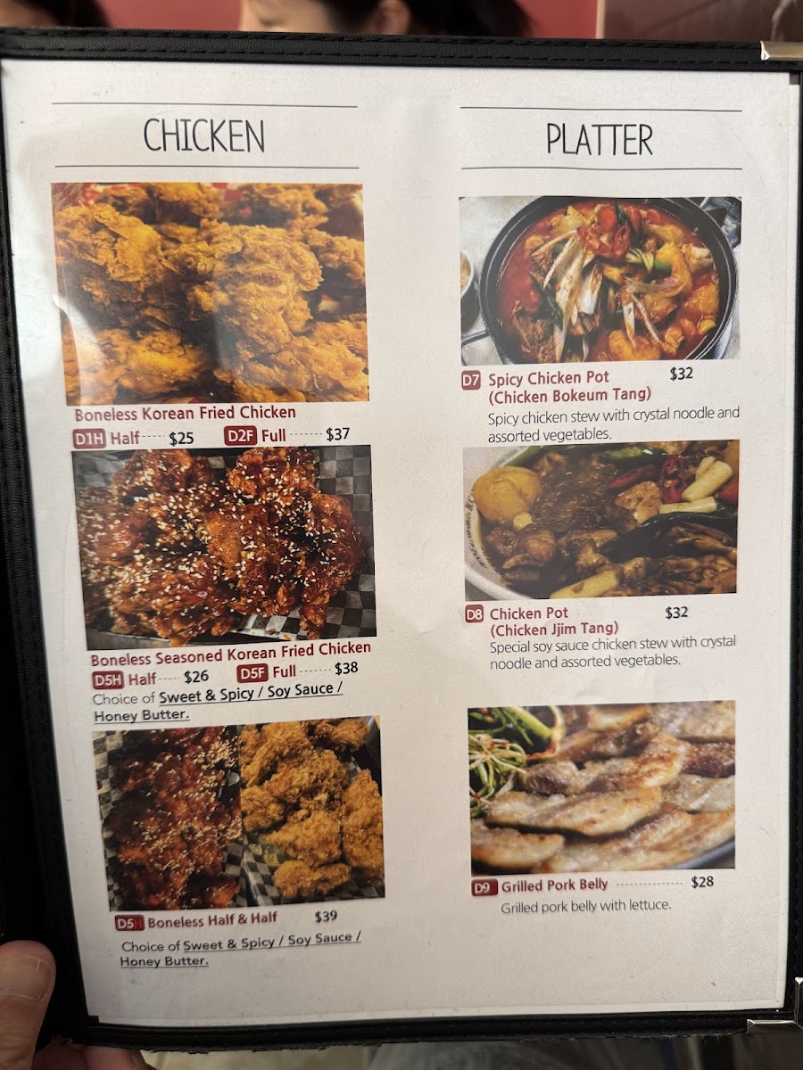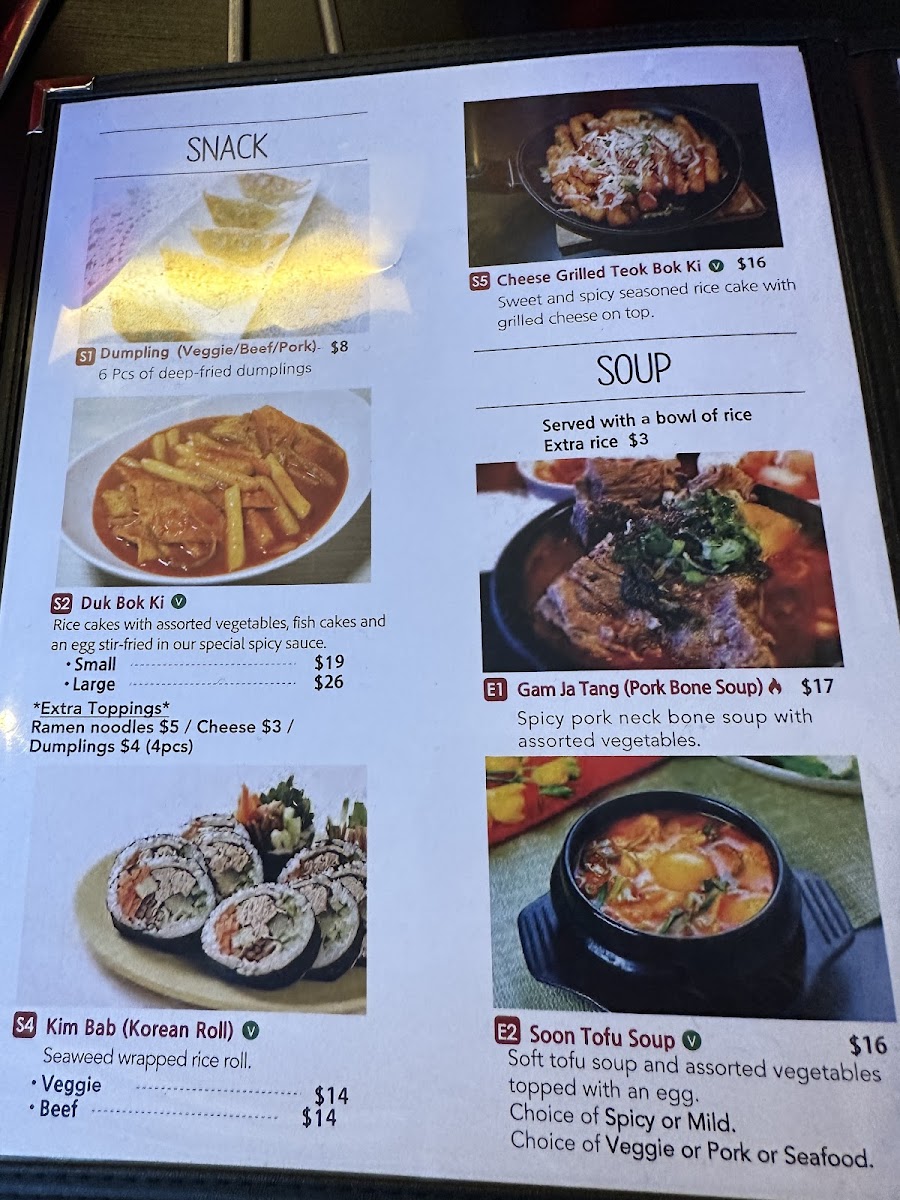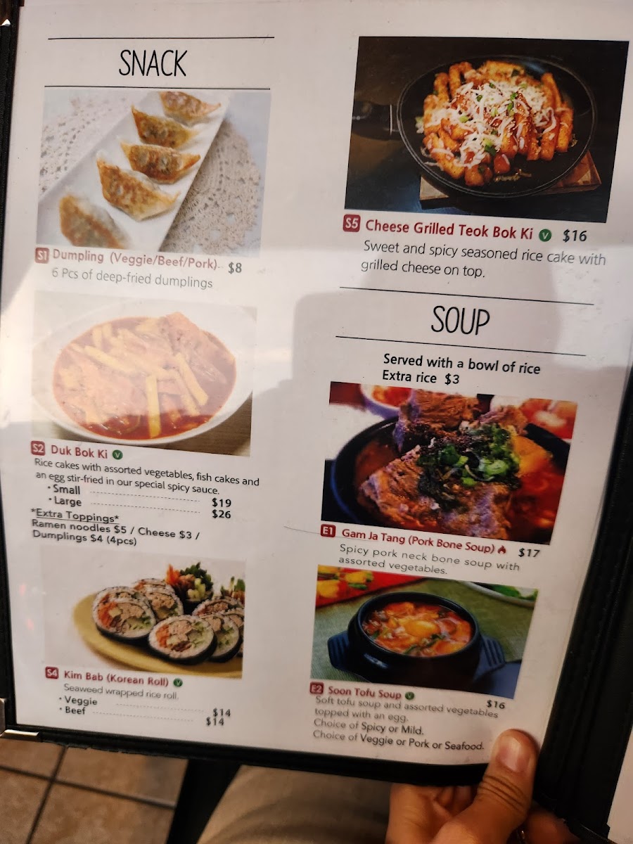 For those looking to enjoy a warm, comforting soup, the menu offers a variety of options, including Bulgogi Soup, Mild Soon Tofu Soup, and the rich Ddeok Dumpling Soup. If you want something more substantial, you can go for a Platter, such as the Budae Jjigae or the hearty Gamjatang Jeongol (Pork Bone Soup), perfect for sharing or when you're feeling particularly hungry.