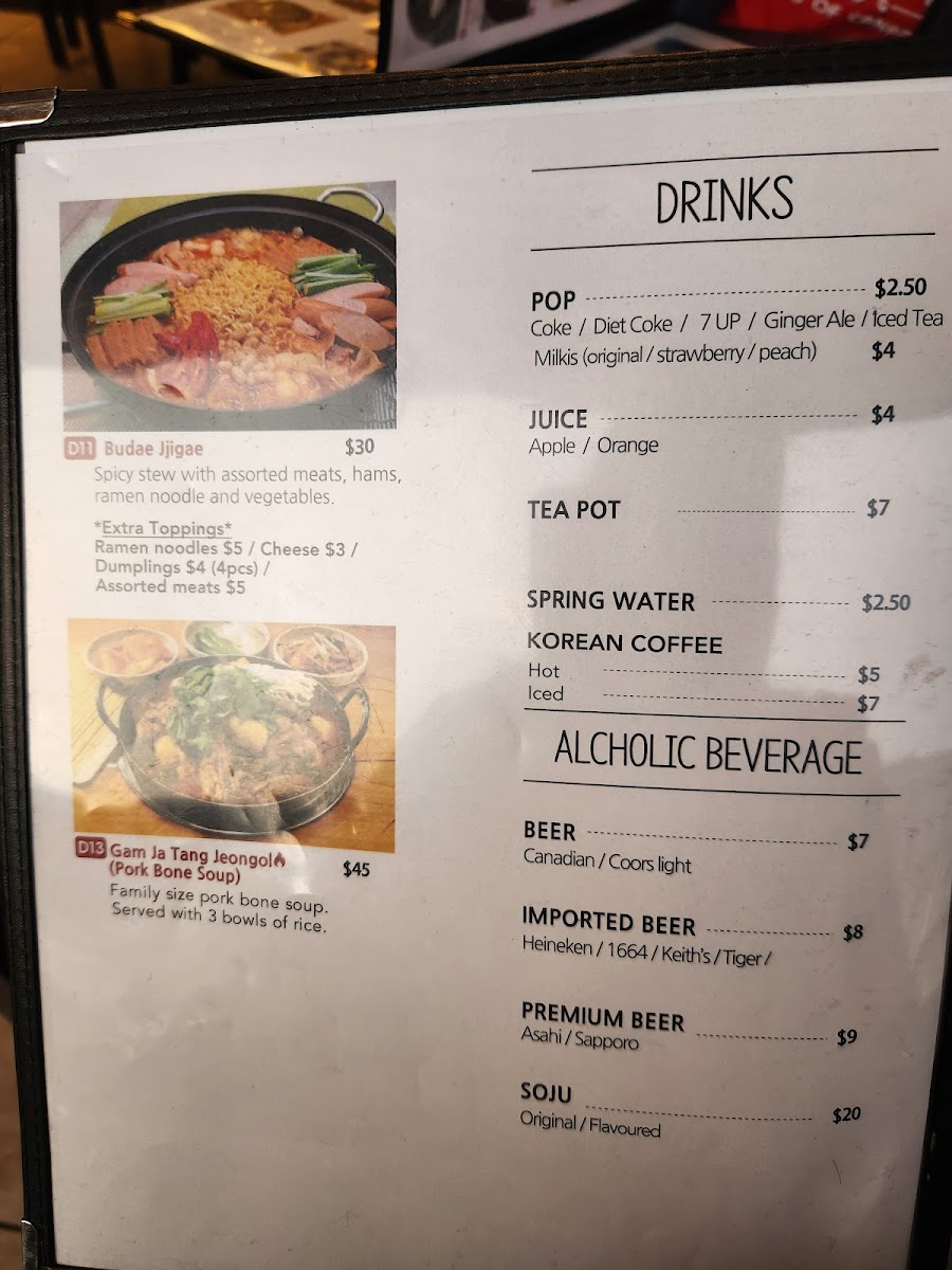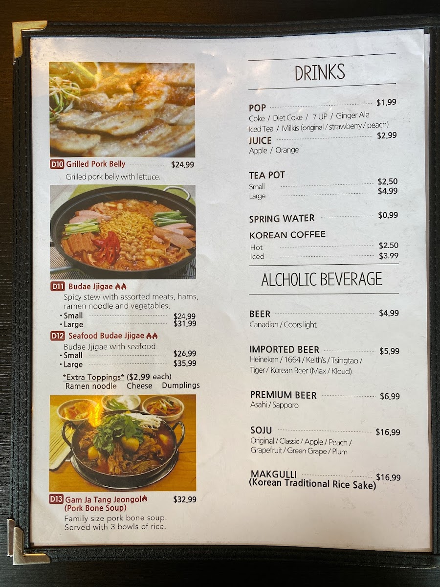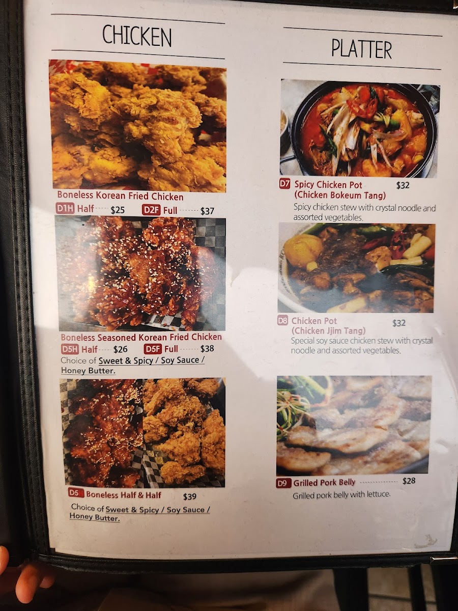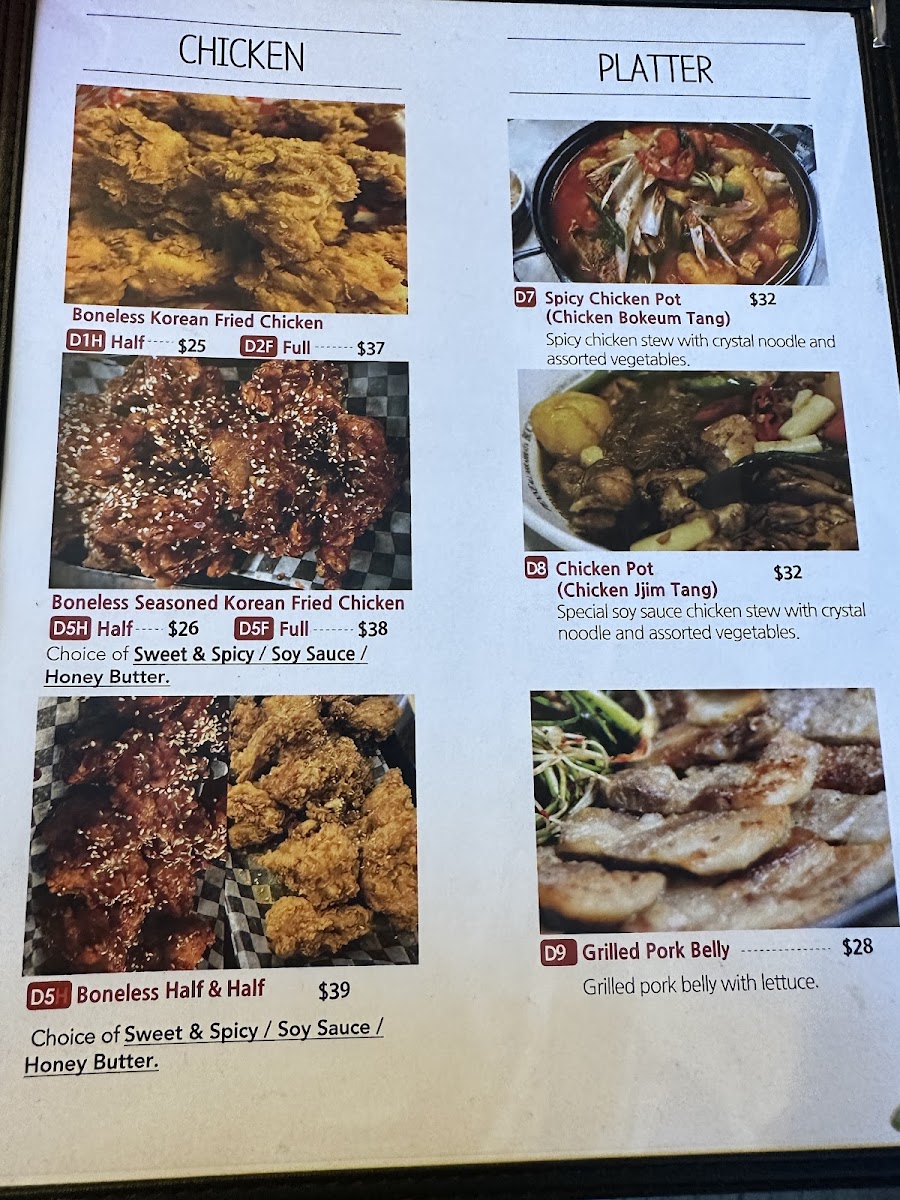 For those looking to enjoy a warm, comforting soup, the menu offers a variety of options, including Bulgogi Soup, Mild Soon Tofu Soup, and the rich Ddeok Dumpling Soup. If you want something more substantial, you can go for a Platter, such as the Budae Jjigae or the hearty Gamjatang Jeongol (Pork Bone Soup), perfect for sharing or when you're feeling particularly hungry.